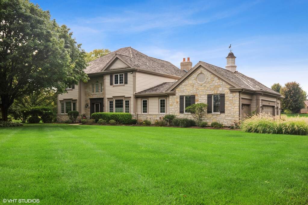 Country club living without the country club fees! Welcome to an extraordinary home situated on the picturesque Steeple Chase Golf Course, boasting numerous updates, cutting-edge smart technology, and breathtaking views that will leave you in awe. This home is part of the beautiful Countryside Lake Association, enjoy private access to the lake, tennis, walking paths and more, just ask! Step inside the two-story foyer, setting the stage for a floor plan designed for both comfortable living and seamless entertaining. Noteworthy features include a chandelier with an electric motor for effortless bulb changes and cleaning. Alexa lets you control the lights, ceiling fans, and other equipment throughout the house with ease (professionally installed by Hooked Up InStalls). The formal living room is perfect for gatherings, complete with a cozy fireplace. French doors open to reveal an elegant library adorned with a wall of custom built-ins, a beamed ceiling, and sliders out to the deck. The fully renovated kitchen is a haven for any chef. Custom cabinetry, a sizable island with breakfast bar seating, granite countertops, and high-end, commercial-grade appliances including a Wolf oven/range as well as a wall oven/microwave, set the stage for culinary excellence. The striking custom range hood adds a touch of grandeur. The bright breakfast area, bathed in natural light, accommodates six guests comfortably and features ample cabinetry. Adjacent to the kitchen and breakfast room, you'll find a practical planning desk, laundry area, and storage cubbies for added convenience. The adjoining family room offers a warm and inviting atmosphere with its charming brick fireplace and sliding glass doors that open up to the deck. For an unparalleled entertainment experience, discover the incredible theater room, tucked away behind pocket doors. Immerse yourself in a luxurious cinematic ambiance, as the walls and ceiling boast sprayed foam insulation, 3/4-inch drywall, and an additional one inch of sound-deadening panels. The room showcases a remarkable 120-inch drop-down screen (Alexa activated), a brand new Sony projector, a wall-mounted 60-inch Samsung TV, and two 36-inch LG TVs (wall mounted). Crown molding lighting, Starlight LED ceiling, sconce lighting, and can lighting can all be controlled effortlessly with Alexa. The installation includes extra PVC to accommodate future upgrades. Retreat to the primary suite, a true oasis within the home. This serene sanctuary features a fireplace, tray ceiling, and captivating views. Indulge in the luxurious bath, complete with a heated floor and towel rack, exquisite Kohler and Grohe fixtures, a built-in TV, two expansive vanities, a separate shower, and a lavish soaking tub. The finished basement offers versatility and ample space for games, an office, or even a guest room. Enjoy the convenience of a built-in Sony TV and a half bath. The concrete walls have been painted and sealed prior to installing the floor covering, ensuring excellent moisture protection. Additionally, the ceilings and walls throughout the house are insulated. Enhancing the lifestyle quotient, the now 4-car garage features LifeStyle Screens and LED lighting. This remarkable home boasts an extensive list of improvements, including an Ecobee thermostat on both the upstairs and first floor, LED outdoor security lighting in the front and back, photocell lighting on the exterior of the garage doors, a central vacuum system, a sprinkler system, and electric remotes for two fireplaces. Gas piping has been conveniently installed on the deck for a gas grill. Ample storage is available above the fourth garage stall. In 2020, 13 Pella Windows were replaced, while the others were serviced by Pella. The house attic received new insulation in 2015. Come and immerse yourself in the unparalleled offerings of this exceptional home, and experience a lifestyle beyond compare!