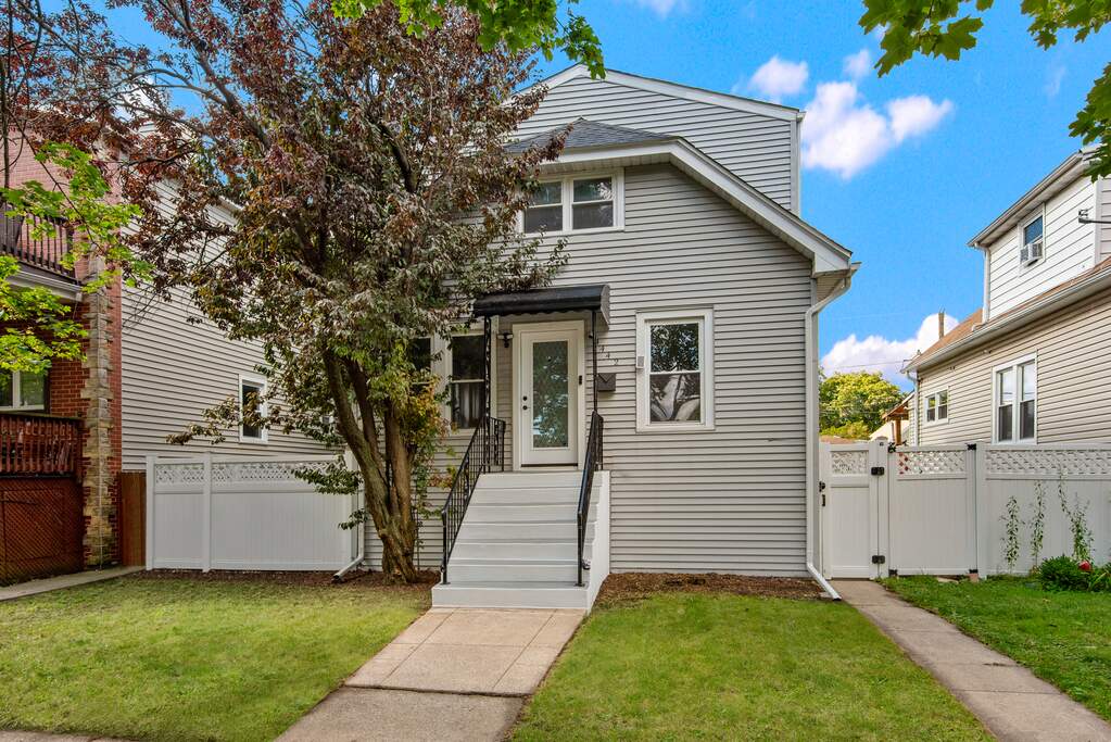 If you're dreaming of a fully renovated home with a massive yard, without leaving the city, look no further! Located on an extra-wide 37' lot on a quiet street in Portage Park, this beautifully updated home offers space, style, and modern updates at every turn. The sun-filled main level features an open-concept living and dining area with gleaming hardwood floors, leading into a stunning chef's kitchen with quartz countertops, herringbone tile backsplash, an oversized island with outlets on both ends, and a walk-in pantry. Let the outdoors in with double glass doors that lead to your 19' x 10' deck, an ideal spot for barbecues, morning coffee, or hosting friends and family. Two spacious bedrooms and a full bath on the main level make ideal guest rooms, in-law space, or offices. Upstairs, the serene primary suite boasts cathedral ceilings with wood beams, skylights, a thoughtfully designed custom walk-in closet, and a spa-like bath with quartz counters, penny tile floors, and an oversized glass shower accented by elegant brass hardware. Another sun-filled bedroom features a skylight, professionally built out closet, and a beautifully renovated full bath with a soaking tub complete the second level. In the basement, you will find a huge laundry room with side-by-side washer/dryer and generous storage space, a family room perfect for movie nights, and an additional space ideal for a home gym, office space, or playroom. This level also features a huge refinished crawl space for added storage. The oversized backyard is fully enclosed with premium 6' white vinyl privacy fencing and includes an elevated patio, a large grassy area with lush mature trees to one side, a custom dog run side-yard complete with river rocks, a detached 2-car garage, and an added concrete carport. Enjoy a 2-car garage with storage potential and the gated carport that could either be used as an extra parking space, a bonfire area, or as the perfect sports court! This backyard oasis offers plenty of opportunity to continue making it your own. With a new roof, skylights, HVAC, washer/dryer, and so much more, this home is completely move-in ready. Prime location near Dunning Square, Ridgemoor Country Club, and multiple parks, including Dunnham Park, which offers a playground, tennis courts, and multiple fields. Commuters will love the easy access to CTA, the Blue Line, the Kennedy Expressway, and ample free street parking. Top-rated schools include Smyser Elementary, Taft High School, and nearby Wright College. This fully renovated home on an oversized lot is truly a rare find!