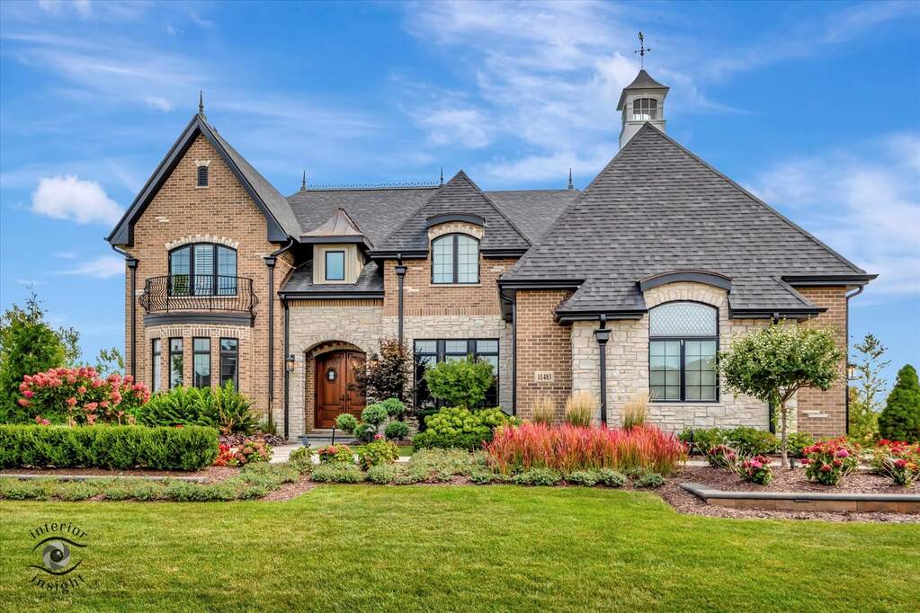 Welcome to this extraordinary 5,083 square foot custom luxury residence, built in 2022, perfectly positioned on a .42-acre fully fenced lot with breathtaking water views and a true resort-style backyard. Designed for both grand entertaining and everyday comfort, this home blends timeless craftsmanship with high-end modern amenities in one of the area's most desirable settings, located within Lincoln-Way East High School District 210. From the moment you arrive, the curb appeal impresses with a paver driveway installed over 5 inches of concrete, a custom paver basketball court, and striking architectural roof details including custom cresting, copper finials, and an illuminated cupola rising over 8 feet tall. Extensive outdoor lighting with color-changing downlights enhances the home day and night. Inside, hardwood flooring flows throughout, complemented by elegant finishes and thoughtful design at every turn. The main level offers a first-floor laundry room, a full bathroom, and beautifully appointed living and dining spaces highlighted by wainscoting and custom ceiling details. The heart of the home is the chef's gourmet kitchen, featuring custom wood ceiling beams, marble backsplash, an oversized island, and top-of-the-line appliances including a Sub-Zero refrigerator, Thermador 48" range with six burners and double ovens, an additional wall oven with rotisserie, a microwave/convection oven combo (four ovens total), and a built-in Meile Coffee system A dedicated beverage center includes two cooling drawers, a wine refrigerator, and chiller, making this kitchen ideal for entertaining. Just off the kitchen, the great room stuns with a dramatic groin vault ceiling lined with mother-of-pearl, softly glowing under evening lighting. A custom upscale fireplace anchors the space, while sliding doors open to a massive deck, offering uninterrupted views of the pool, water, and abundant natural light. One of the home's signature features is the private study with a two-story library, complete with floor-to-ceiling windows, built-in bookshelves, and a spiral staircase leading to a second-level library overlook-a true architectural showpiece. The primary suite is a private retreat spanning approximately 1,500 square feet, featuring French doors to a private balcony, serene water views, a custom electric fireplace, a dedicated exercise room, and an extraordinary walk-in closet with dual islands and seating. The spa-like primary bath includes heated floors, a rain shower with body sprays, a freestanding soaking tub, double vanities, and exquisite tile work, accented by custom wood beams throughout the suite. Every bedroom offers the luxury of a private ensuite bath, with a total of 4 bedrooms and 5 full bathrooms. The third-floor guest suite provides over 400 square feet of private living space, complete with a full bath and walk-in closet-ideal for guests or extended family. The walk-out basement is unfinished and ready for your vision, already roughed in for a bathroom, and opens directly to the backyard oasis. Outside, the grounds rival a luxury resort with an in-ground pool featuring an electric cover, expansive paver patios, and a stunning pavilion equipped with a fireplace, heaters, electric, and extensive lighting. Beneath the 32' x 8' deck, a covered outdoor space includes an outdoor kitchen including a built-in grill, fire feature, bar, and refrigerator. Additional highlights include a built-in gas fire pit, a dramatic waterfall feature, and panoramic water views from nearly every outdoor space. Additional features include a 3-car garage pre-wired with 220V for electric vehicles, two transmitters, two HVAC systems with two furnaces, two 75-gallon hot water heaters, water softener, and reverse osmosis system. This one-of-a-kind home offers unmatched design, luxury finishes, and an entertainer's dream setting-an exceptional opportunity rarely found.