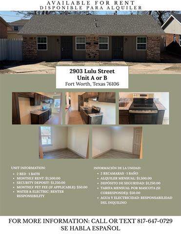 2903 Lulu Street, Fort Worth, TX 76106 is a rental currently listed at $1,500. 2903 Lulu Street features 2 Beds, 1 Bath. This rental has been listed on Christie’s International Real Estate @properties lone star since April 9th, 2026 and was built in 1985. Nearby schools include Diamond Hi, Meacham, and Jarvis.