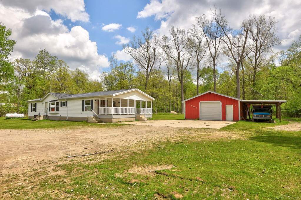 If seclusion and room for toys is what you've been looking for, this is the listing for you! Tucked away on a quiet wooded setting this property sits on 2.5 acres, has a pond and multiple outbuildings ready to be filled! The home has an open floor plan which includes 3 bedrooms, with a master suite and 2 full bathrooms. Multiple heat sources, a newer water heater and updated metal roofs provide functionality. Kitchen has ample storage, included appliances and panty space, as well as wood paneling that give it rustic charm fitting to the setting. Sliding glass door gives direct access from the dining area to the covered porch where you can sit and enjoy the peace and quiet. Outside you'll find the detached 32x24 heated garage with 24x24 lean to, 32x14 lean to and concrete that is set up for a 2-post lift. Up front is the 36x24 Pole Barn with Three 9x8 overhead doors, 2-post lift ready and a 36x18 lean to. As well as another 23x23 insulated versatile-use building with an overhead door opening that was originally used as a salon and then converted to storage space. This property has so much to offer!