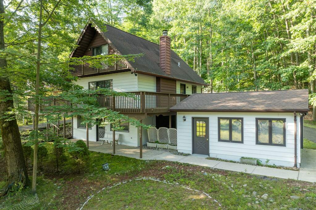 Nestled in the tranquil North End of Canadian Lakes, this charming home is a hidden gem with endless potential. Whether you're seeking a peaceful cottage getaway or a full-time residence, this property offers the perfect blend of comfort and opportunity. This property presents a prime turn-key opportunity for the right offer. The home, though slightly dated, is brimming with possibilities to make it your own. Step outside onto the expansive wrap-around deck, where you'll be captivated by the serene views of Lost Canyon Lake. The property is beautifully wooded, offering the quintessential ''Up North'' feeling that so many desire. Lost Canyon Lake and Park area across the st for your enjoyment. Full CL amenities, boat docking and free golfThe spacious wrap-around driveway welcomes you to a detached garage, providing ample space for parking and storage. Inside, you'll find new stainless steel appliances, ready to elevate your culinary experiences. The full walkout basement is a cozy retreat, featuring a brick fireplace, a comfortable living area, an extra bedroom, and a convenient laundry/utility room. This home is a canvas awaiting your personal touch. With its potential and stunning surroundings, it's a rare opportunity in Canadian Lakes that you won't want to miss.