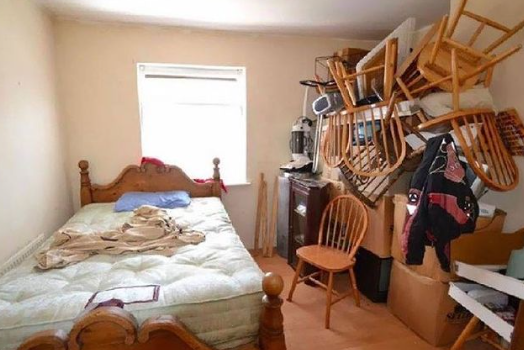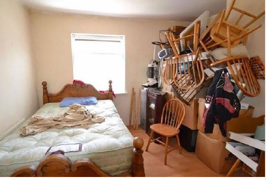 Perhaps this owner was hoping buyers wouldn't notice the unmade bed if they created a chair tower in the corner? Points for creativity.